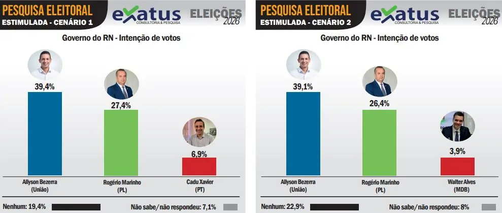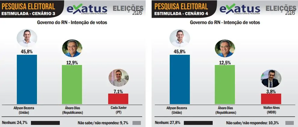 Em outro cenário, Allyson Bezerra amplia a distância. O prefeito de Mossoró chega a 45,8%, enquanto o ex-prefeito de Natal Álvaro Dias (Republicanos) registra 12,9% e Cadu Xavier, 7,1%. Brancos e nulos somam 24,7%, e 9,7% não souberam responder.